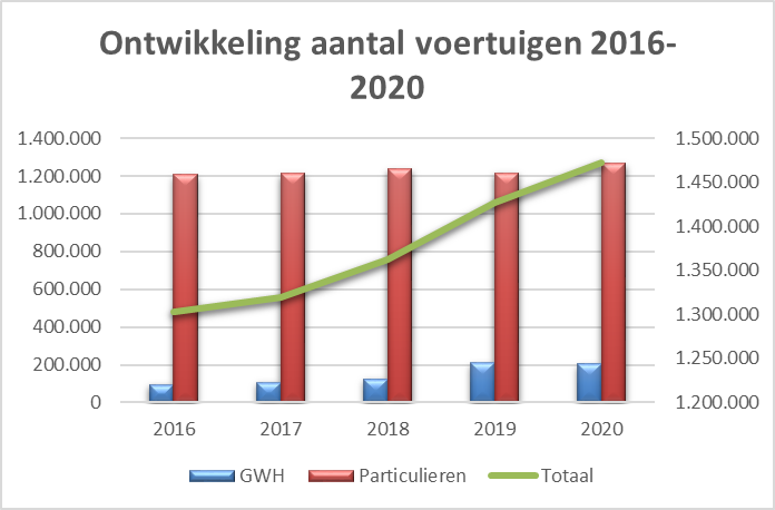 Onderstaande grafiek toont dat het totaal aantal voertuigen in onze provincie is gestegen van 1.295.000 voertuigen eind 2015 naar 1.472.000 voertuigen eind 2020. Bij de leasevoertuigen zien wij een stijging van 95.000 leasevoertuigen in 2016 naar 205.000 leasevoertuigen eind 2020.