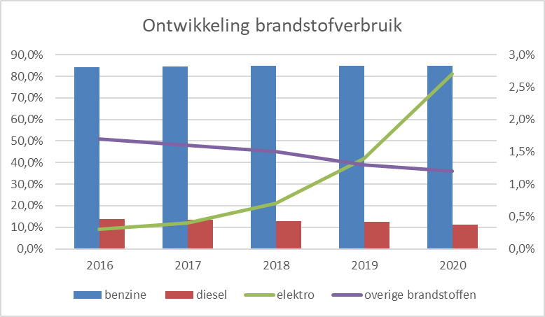 In de navolgende grafiek wordt de ontwikkeling van het brandstofverbruik van de voertuigen weergegeven vanaf 2016 tot en met 2020. Het aantal voertuigen dat gebruikmaakt van de brandstof diesel neemt af. Waren er in 2016 nog 180.091 voertuigen die op diesel reden (14% van het totaal aantal voertuigen in Noord-Holland), eind 2020 waren dit er 162.887 (11% van het totaal aantal voertuigen). Bij de elektrische auto’s is een stijging te zien. Eind 2016 waren dat er 3.618 (0,3 % van het totaal aantal voertuigen) en eind 2020 40.197 voertuigen (zijnde 2,7 % van het totaal aantal voertuigen). Een ontwikkeling die in de toekomst van invloed kan zijn op de opbrengst opcenten motorrijtuigenbelasting in onze provincie.