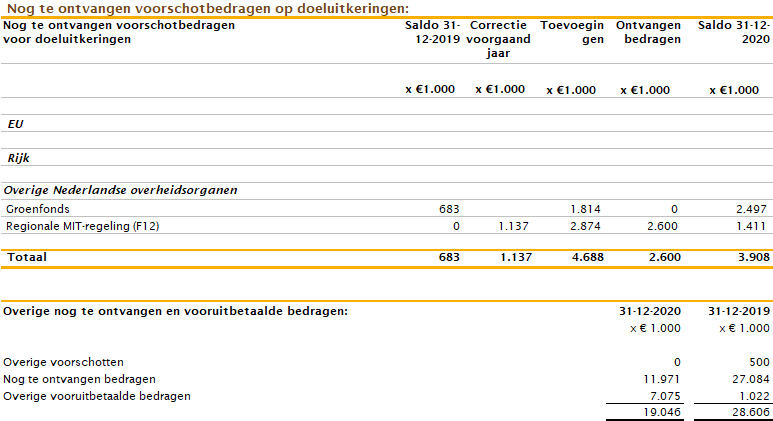 Het saldo van de overlopende activa is afgenomen met ca. € 7,6 miljoen. Deze afname komt met name doordat enkele grote vorderingen van totaal ca. 15,8 miljoen in 2020 zijn ontvangen. Hier tegenover staat een toename van de vooruitbetaalde bedragen met ca. € 6 miljoen.